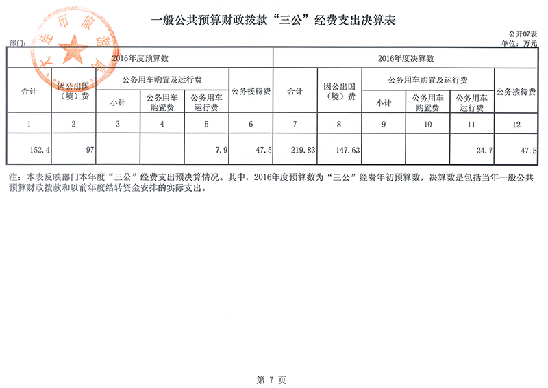 七、2016年度一般公共预算财政拨款“三公”经费支出决算表